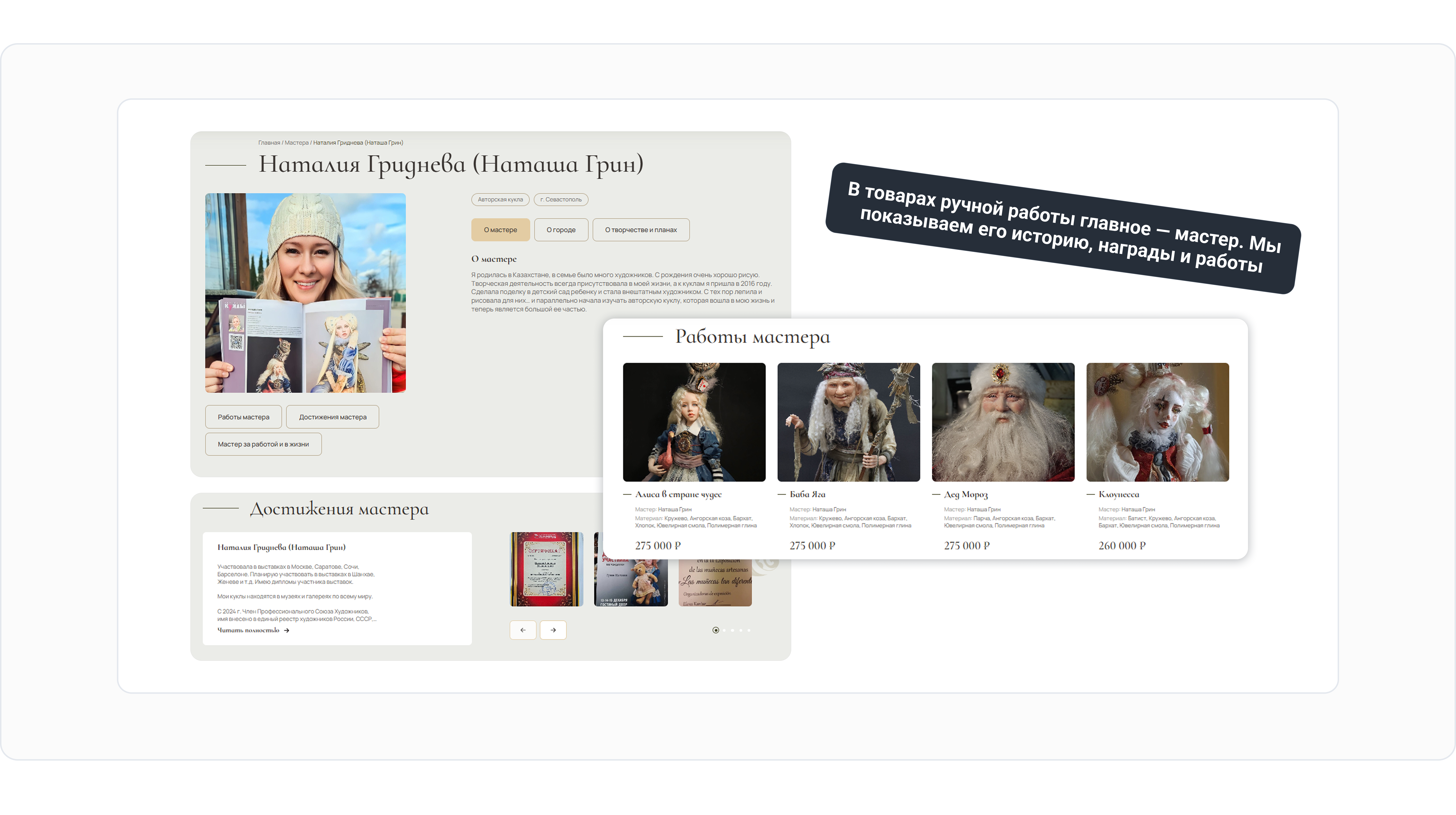 Страница каждого мастера стала его личной витриной: здесь собраны работы, достижения, биография и галерея.