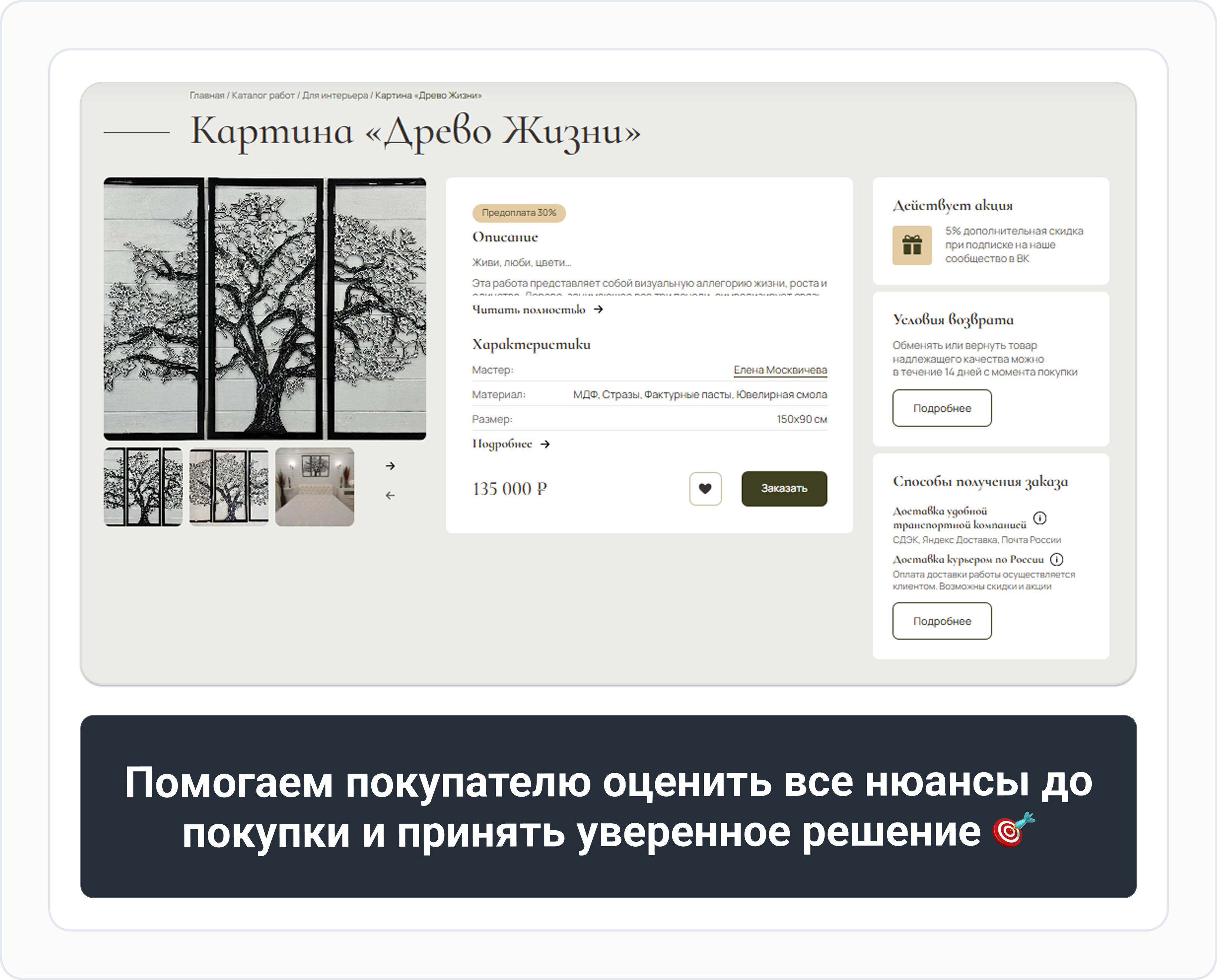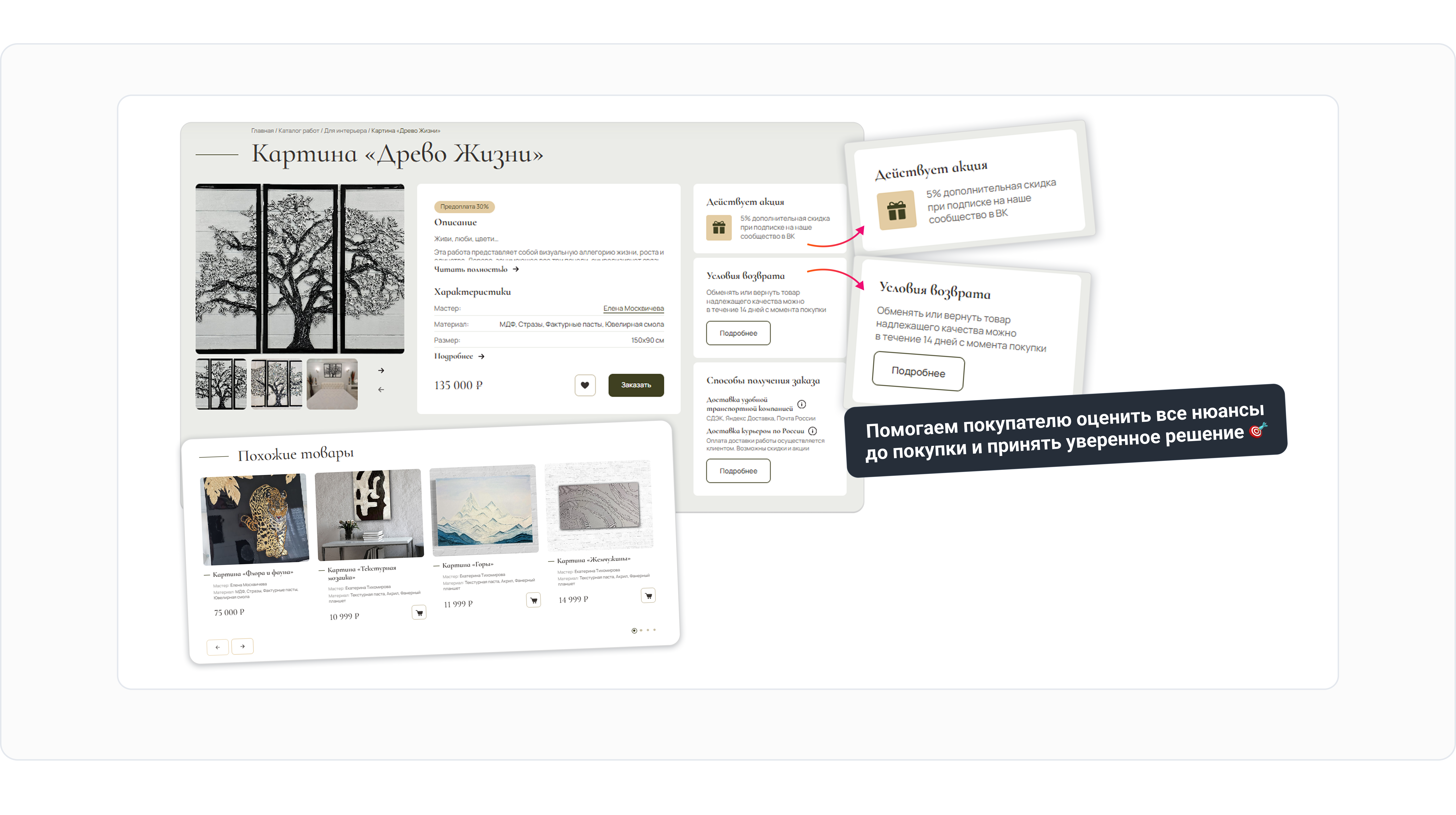 Поэтому мы детально проработали карточку: покупатель сразу видит, как пройдёт доставка, есть ли скидка и как вернуть товар,